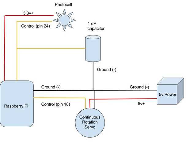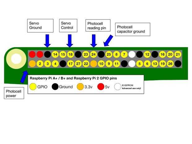 Un lado de la fotocélula se conecta a un 3.3v pin en la pi y la otra pata se conecta a uno de los pasadores de IO (elegí pin 24). Esta etapa también se conecta a la pata positiva de un condensador de 1uF. La pata negativa del capacitor se conecta a tierra.