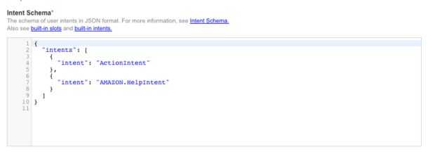- Esquema de intención = {"intenciones": [{"intenciones": "ActionIntent"}, {"intención": "AMAZON. HelpIntent"}]}
