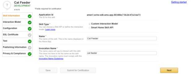 Una vez registrado, vaya a la sección de Alexa y empezar con el Kit de habilidades de Alexa. Añadir una nueva habilidad y proporcione la siguiente información: