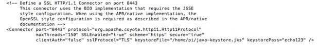 • Quite el comentario del puerto SSL 8443 (puerto conector = "8443"...) y agregue una referencia al archivo de claves: keystoreFile="/home/pi/java-keystore.jks" keystorePass = "YOURPASS"