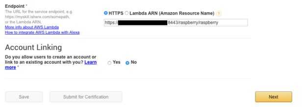 Vuelve a tu habilidad de Alexa y actualizar el punto final con su IP/nombre de dominio, puerto, nombre de aplicación (contexto), nombre del servlet (eg.: https://mysite.no-ip.org:8443/frambuesa/frambuesa)