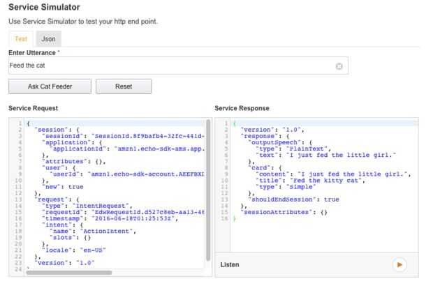 Ahora está todo listo! Puede probar utilizando las herramientas de prueba de Alexa en el portal del desarrollador o simplemente pedir su eco Amazonia.
