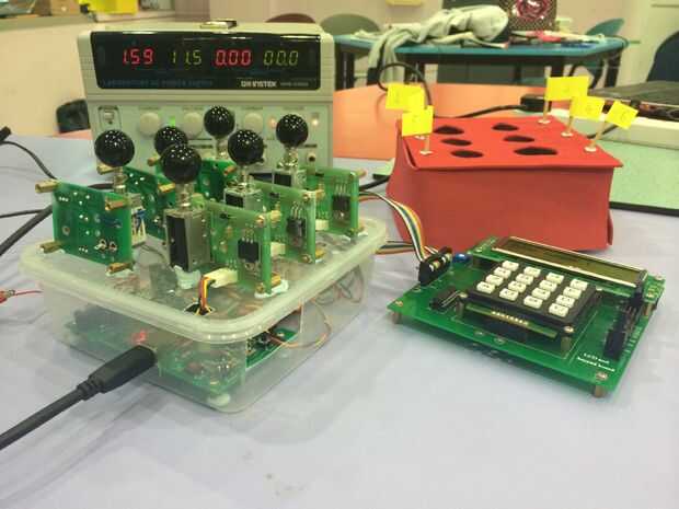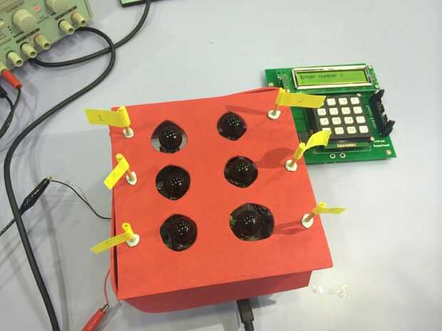 Los cables de cinta arco iris están conectados al microcontrolador, entrada y salida de dispositivos. Se utilizó una fuente de voltaje de 12V CC para los motores de solenoide.