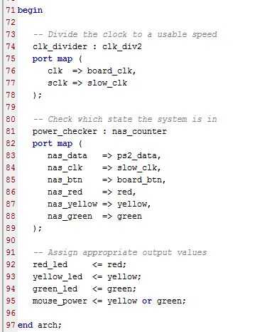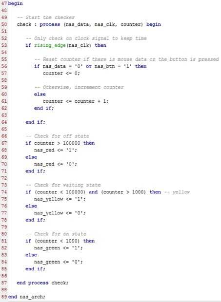 El archivo Nascounter determina qué estado el circuito debe estar en. Lo hace leyendo entrada de PS/2 del ratón y las señales de reloj de conteo. Como los archivos están ahora mismo, la limitación de tiempo del estado de espera se establece en 6 segundos. Dentro del estado de control, en línea 68, el valor se puede cambiar para alcanzar una longitud de espera diferente de tiempo. (Nota: cambiar la frecuencia en clk_div2 también cambia la restricción de tiempo.) Este archivo pasa todas las salidas a ratón ambiental.