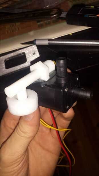 La bomba que utilizo es un aqvariumpump muy simple y pequeño. Funciona con 12v. La bomba se encuentra en la parte inferior del tanque y se asegura con pegamento caliente. Es alimentado por uno de los convertidores de DC a DC (stepdowns). A partir de ahí va el relé que se controla a través del Arduino a través de un TIP120. Aunque se trata de un 12v bomba me schose a rubn en 6v por lo que la presión no llega a las altas.