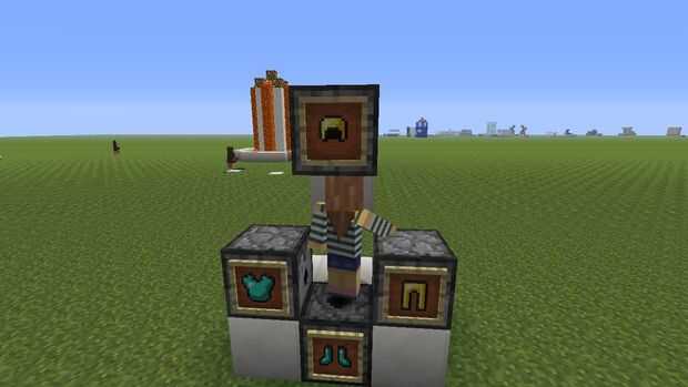 Este paso es opcional poner un cuadro de artículo en cada uno de los el dispencer. Los zapatos poner fondo uno que arriba puso un casco de la derecha uno pone polainas y el izquierdo puso un chestplate.