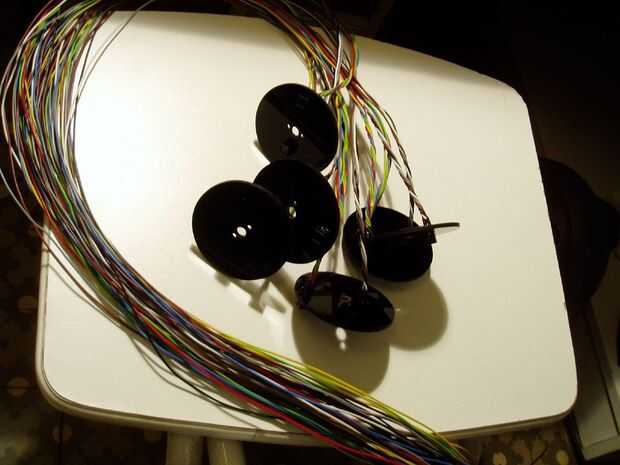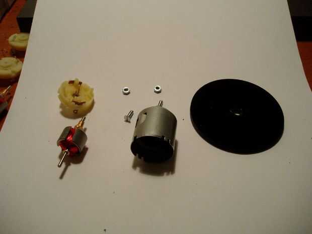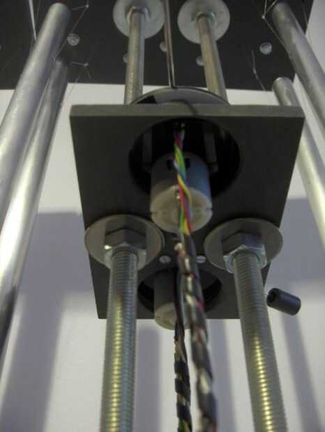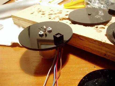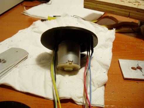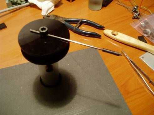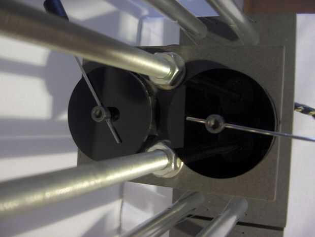 Siguiente paso fue la construcción de los dispositivos que se mueven los palos de delantero. Esto fue otra parte crítica, y como veis en las fotos, finalmente decidió utilizar motores de la C.C. para mover cada delantero. Cada motor tiene el palo delantero y un sistema de control de posición que se le atribuye y se utiliza para golpear a un par de campanadas. El palo el delantero es una pieza del punto de la moto con un cilindro de madera negro al final. Este cilindro se cubre con una fina película de plástico auto adhesivo. Esta combinación de materiales le da una sonoridad suave pero fuerte al golpear las barras. De hecho he probado algunas otras combinaciones, y esta fue la que me dio los mejores resultados (agradecería si alguien me deja saber una mejor). El sistema de control de posición del motor es un codificador óptico de 2 bits de resolución. Se compone de dos discos: uno de los discos gira solidario al palo y tiene una codificación de blanca y negra impreso sobre su superficie inferior. El otro disco está fijado en el motor y tiene la propiedad colectiva de los dos sensores infrarrojos CNY70 emisor-receptor que puede distinguir el color blanco y negro del otro disco, y por lo tanto, puede deducir la posición de la palanca (delante, derecha, izquierda y atrás) sabiendo la posición permite que el sistema centrado el palillo antes y después de golpear una campana lo que garantiza una precisse más movimiento y sonido.