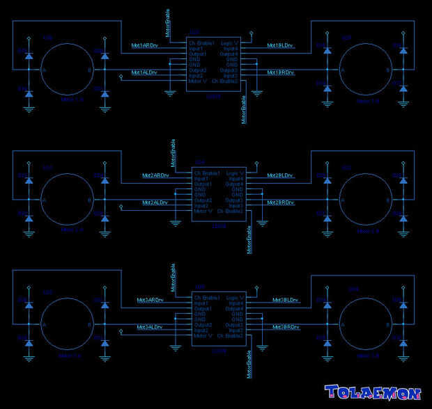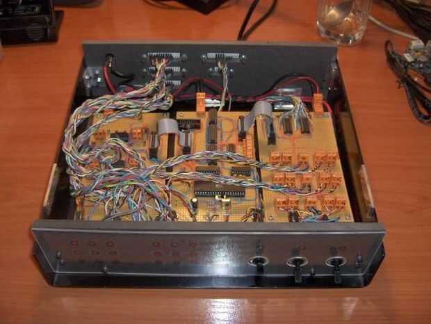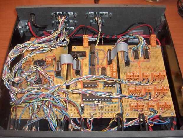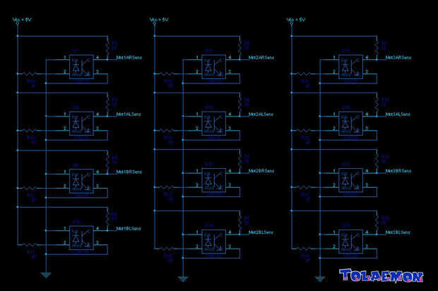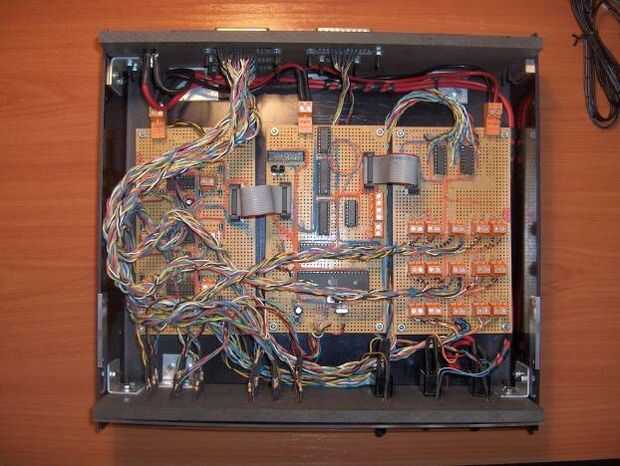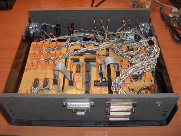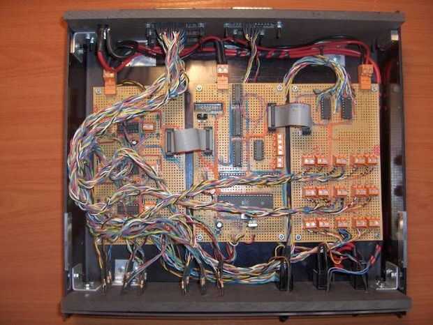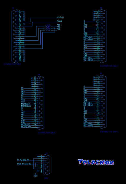 Una vez terminé las tres torres, era el momento de construir la unidad de control. Como expliqué al principio del texto, la unidad de control es una caja negra conformada por tres tableros electrónicos. La tarjeta principal contiene la lógica, el adaptador de comunicación serie (MAX 1-232) y el microcontrolador (un microcontrolador ATMega32 pedacito 8 RISC). Las otras dos tablas contienen los circuitos necesarios para controlar los sensores de posición (algunas resistencias y 3 disparadores schimdt 74LS14) y potencia de los motores (3 controladores de motor de LB293). Puedes echar un vistazo a los esquemas para obtener más información.