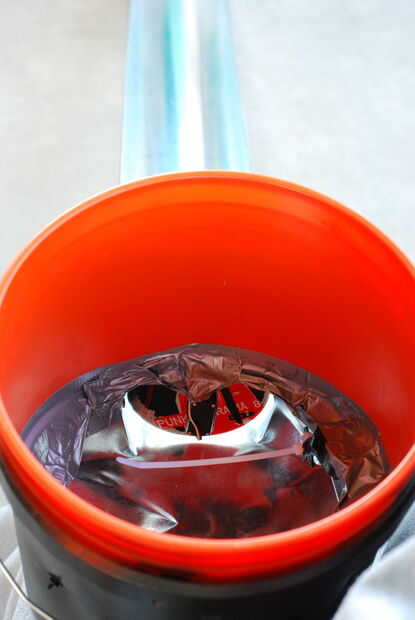 Después de inserta el tubo de ventilación que hice unos cortes para permitirme ampliar la tubería en forma de hoja. Usé un par de tornillos y pernos para mantener la lámina unida al cubo. El resto del espacio estaba cubierto por la cinta pato poderoso.