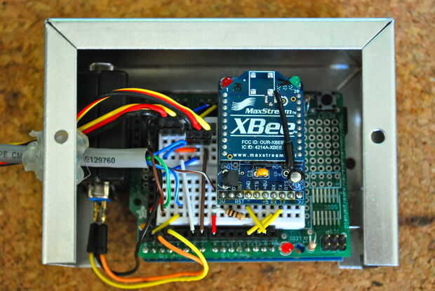 El bucle principal está esperando sea un empuje físico del botón rojo grande o para recibir un mensaje remoto serial. El módulo XBee conectado se comunica con otro módulo XBee conectado a la ioBridge IO-204 módulo serial Junta.