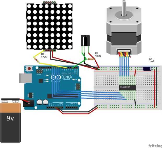 Coloque el 1mF 6.3V+ condensador entre el borne positivo y tierra la matriz de LED. También, colocar el resistor de 300-500 ohm entre el pin de salida del Arduino y el pin DIN en la matriz de LED.