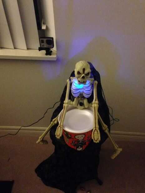 - Un espeluznante esqueleto conectado con LEDs y el servo para controlar la cesta de regalo