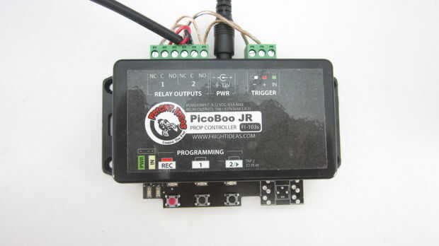 Para este proyecto, estoy utilizando un controlador de PicoBoo. Se trata de un sistema de grabación-reproducción. En lugar de programar la sincronización exacta de las funciones de salida, activar manualmente cada función en la secuencia. El controlador es capaz de reproducir la secuencia cada vez que se dispara. La principal ventaja de este tipo de sistema es que es rápido y fácil de configurar y no requiere ninguna habilidad de programación. También cuenta con un controlador de relé para control de motores. Así que no hay circuitos externos deben (a excepción de sensores opcionales para activación).