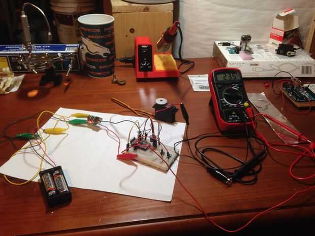 Antes de cablear nada hasta, que el prototipo del software con el sensor de temperatura Resistor dependiente de luz (LDR) y configuración del motor servo en un protoboard. Simplemente use su mano para tapar y destapar el LDR para simular los cambios entre la luz y la oscuridad. Usé un secador de pelo para simular las condiciones de verano y que por encima del límite de temperatura. Si es posible, utilice al monitor serial para examinar cuáles son sus salidas en las horas del día que usted quiere las persianas de apertura o cierre. Es cómo surgió con los números en el código.