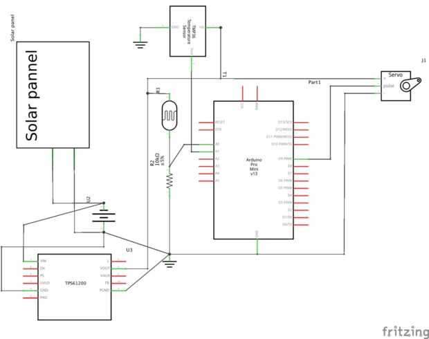 Ignorar la (mal escrito!) Circuitos de Panel solar y de refuerzo a la izquierda - Fritzing no parece tener lo que quería, y yo no he pasado el tiempo para averiguar cómo añadirlo.
