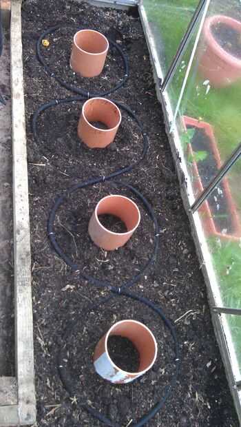 Creo que es mejor poner la manguera todo lo que queráis para crecer y luego poner más tierra encima para que no se evapora durante el día.
