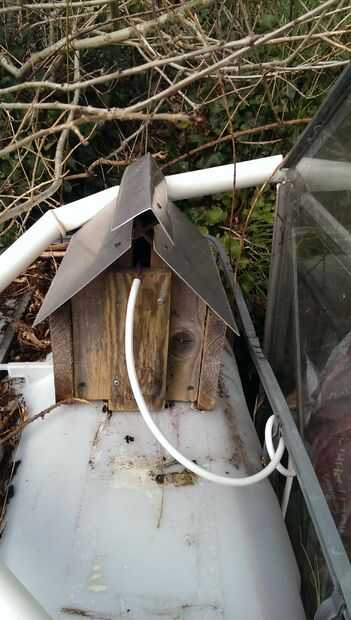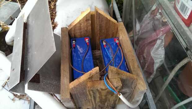 primero necesitas un lugar para almacenar las baterías (creo que usted podría conseguir lejos con un solo, pero decidí usar 2 como he añadido una pequeña manguera a mi sistema). hice una pequeña caja de algunos palets viejos para mantener las baterías secas y almacenarlos fuera. construí un pequeño tejado que permite la ventilación pero se detiene la lluvia entren en el recinto.