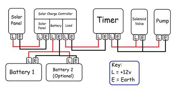 luego conectar algunos cables a los terminales de la 'carga' en el cargador solar y ajustarlas al temporizador programable para las conexiones de alimentación. y finalmente desde el lado de salida del temporizador para la bomba y la válvula solenoide.