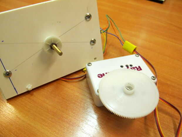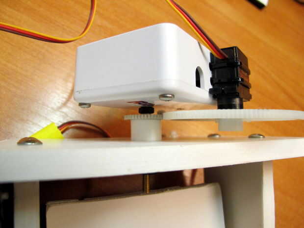 Los dos engranajes que tienen una relación de 1:3. El engranaje más grande está en el servo porque gira solo 180 grados y necesito base para girar 360.