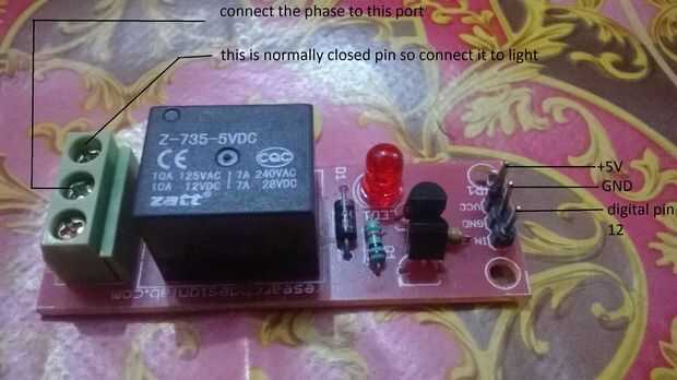 3) conectar la clavija IN del relais en el pin digital 12 de la arduino uno (puede usar otro pin digital de arduino ONU como desee pero debe cambiar el pin numbor en el programa)
