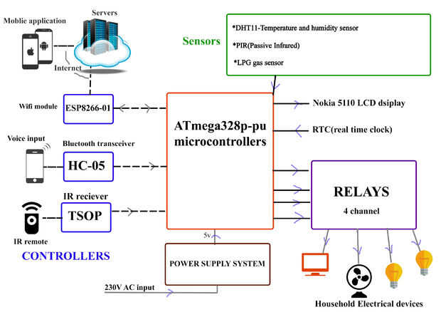 Este sistema consta de 3 placas de uno de arduino construido personalizado, dos de los cuales están conectados entre sí mediante bus I2C, uno de los cuales actúa como un "maestro remitente" y el otro un "receptor de esclavos". Sistema de domótica se puede controlar usando Internet, lo que se logra mediante el uso de las bibliotecas ESP8266-01 y blynk. También nos permite controlar el sistema de dar comandos de voz usando el módulo bluetooth HC-05 y la aplicación de voz AMR.