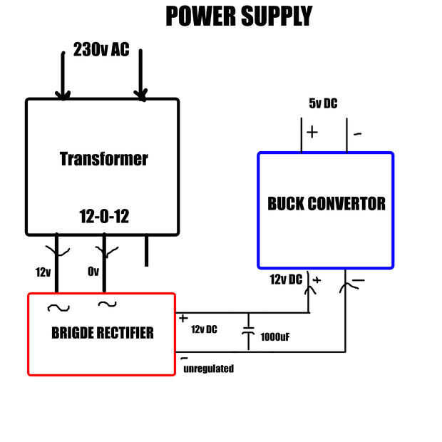 * 12V DC (no reglada) se aplica a las entradas de una etapa DC-DC BUCK conversor. El convertidor buck se ajusta para obtener la tensión de salida de 5V DC.