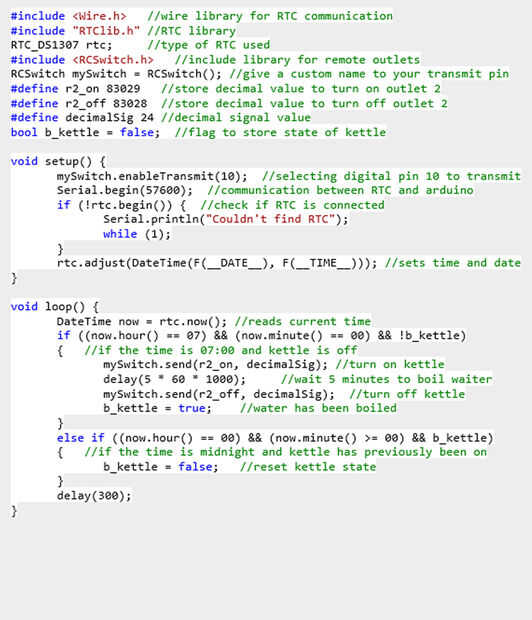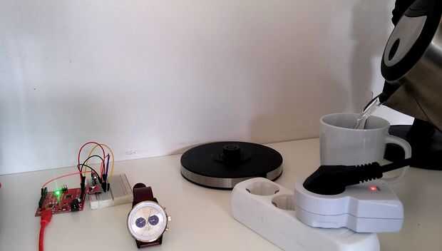 Lo que está escrito que el microcontrolador encenderá mi hervidor de agua cada día a las 6:00, hervir el agua y apagarlo de nuevo cinco minutos después. Estoy usando esto para empezar cada mañana con agua caliente listo para una taza de café!