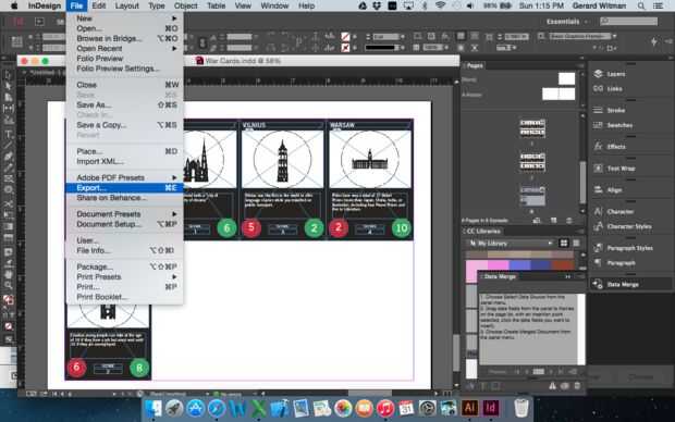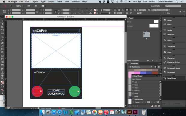 Flujo de trabajo Nota: prefiero a exportar mis documentos datos se fusionaron en un nuevo documento. Esto conserva mi plantilla original pero me permite hacer cambios menores a las tarjetas individuales si quiero. Clic clic clic y InDesign generan un nuevo documento que tiene todos los archivos en un diseño de múltiples.