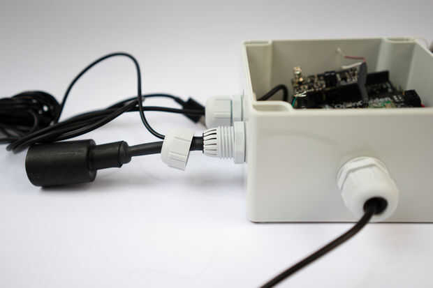 - Inserte los cables rojo, verdes y negro sensor de la temperatura, la humedad y la humedad en el agua prueba tapa y en el cuerpo de la caja.