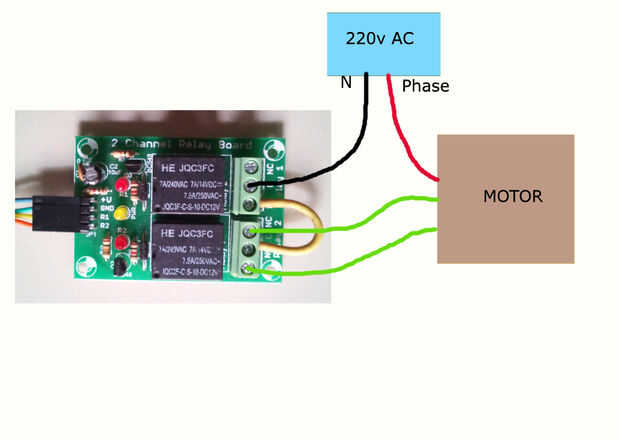 Motor de lavado contiene 3 cables. En mi lavadora uno conectado directamente a la fase. Dos para el movimiento CW y CCW restantes. Conecté a través de la placa de relé como se muestra en la imagen. Neutro está conectado a la placa de relé como se muestra en la imagen. Cuando el relé 1 es motor rotación CW. Cuando están ambos relés motor gira CCW.