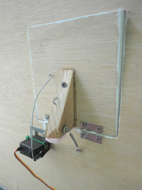 Las pequeñas ventanas fueron Unidas con un muelle, para que por defecto la primavera siempre se tire hacia abajo de la ventana (abrir la ventana) cuando no hay nada contra él. Y la función del servo es hacer retroceder a la ventana contra el muelle (cerrar la ventana).