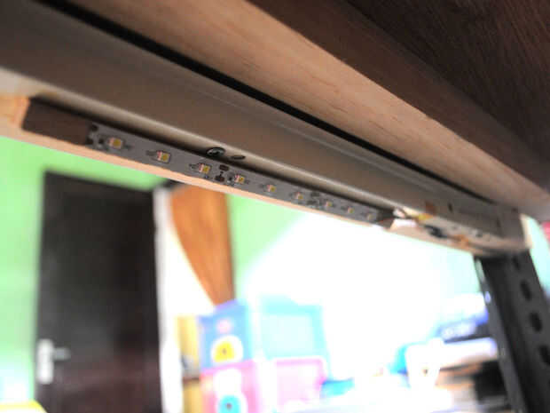 He instalado las tiras de LED dentro de la caja, en el techo. El propósito es para la iluminación de apoyo cuando quiero tomar una foto como componentes electrónicos. El otro lugar que he instalado la tira del LED era debajo de mi caja, que es el almacenamiento. Iluminación adicional debajo de la caja es muy útil para mí para conseguir mis cosas o cuando buscaba componentes en el rack.