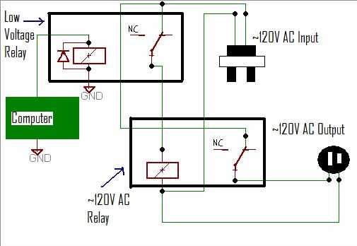IMPORTANTE: Los relés se muestran en la posición ON (mi error). Asegúrese de alambre para que los circuitos quedan normalmente abierto y cerrado cuando se activan los relés. Además, los cables que cruzan entre sí pero que no tienen un punto negro en la intersección significa no conectado. No conecte los cables juntos o se fundirá el enchufe de pared en tu casa!!!!