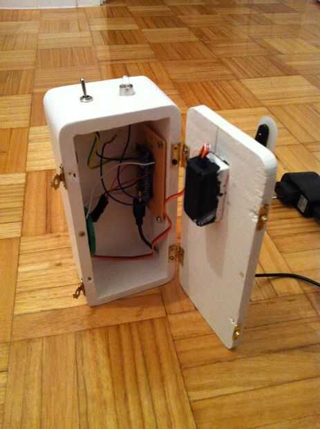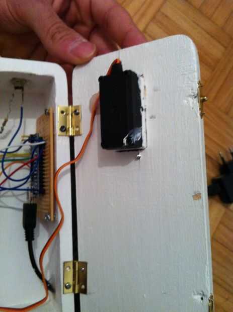La madera era muy fácil de cortar, así que usando un cuchillo rígido y cúter que trabajé fuera del rectángulo para el servo, las imperfecciones desgastadas con lija otra vez. El servo se puede conectar fácilmente con tornillos que generalmente vienen con él. Tres agujeros debían perforarse así para colocar el LED y el interruptor (ambos fueron fijados con tuercas que vienen generalmente con ellos otra vez) y el cable de alimentación.