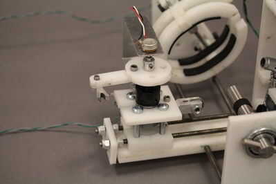 Los mecanismos de calificación y lijadoras se montan sobre una plataforma única perpendicular a la pista principal. Un motor DC con un potenciómetro gira el brazo de puntuación en su lugar una vez que la botella se corta. La rueda para marcar permanentemente montada y así las puntuaciones constantemente la botella mientras está girando. La plataforma única para las dos operaciones simplifica el control del motor y maximiza el espacio. El diseño original tenía tanto la puntuación y lijar los brazos giran en su lugar, pero dificultades con puntuación de alineación y fuerza aplicada nos llevaron a cambiar los diseños. La plataforma perpendicular en la que se montan el marcador y lijado mecanismos se mueve en manualmente girando la varilla roscada hasta que el Rodel es ponerse en contacto con la botella.