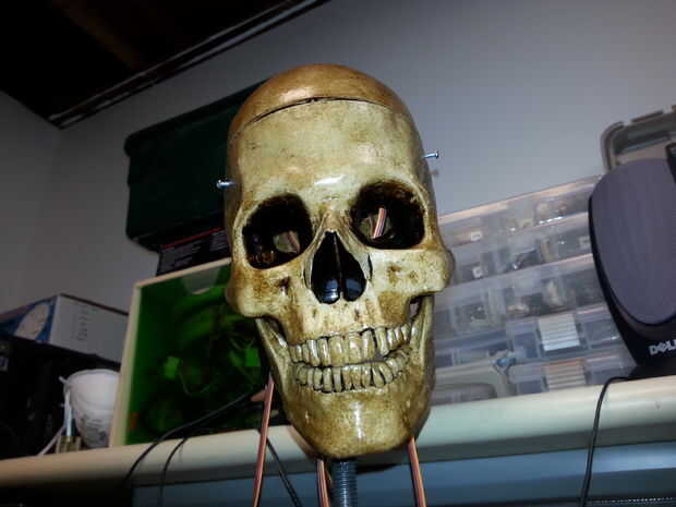 Este instructable le mostrará cómo agregar un movimiento de la mandíbula a una calavera, calabaza u otros prop de vacaciones. Usé esta para hacer mi charla 3 eje cráneo en mi caldero de fluencia cuando un detector de movimiento. Este circuito no requiere programación y sincronización para arriba con fuente de audio, pero incluyen algún código de arduino para controlar un reproductor de MP3 para tomar más, y se muestra cómo agregar un sonido de disparo a un archivo de audio si el audio de la fuente tiene un montón de ruido ambiental impidiendo que detectar la hora correcta para abrir y cerrar el circuito.