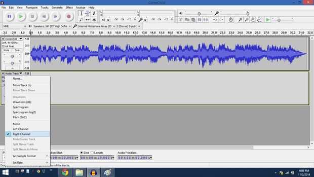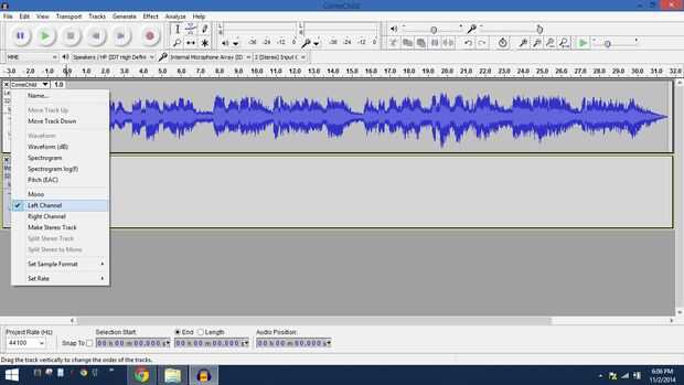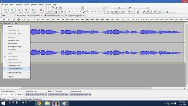 3. dividir el archivo de sonido estéreo en dos pistas Mono haciendo clic en las pistas: desplegable flecha >> Split Stereo a Mono