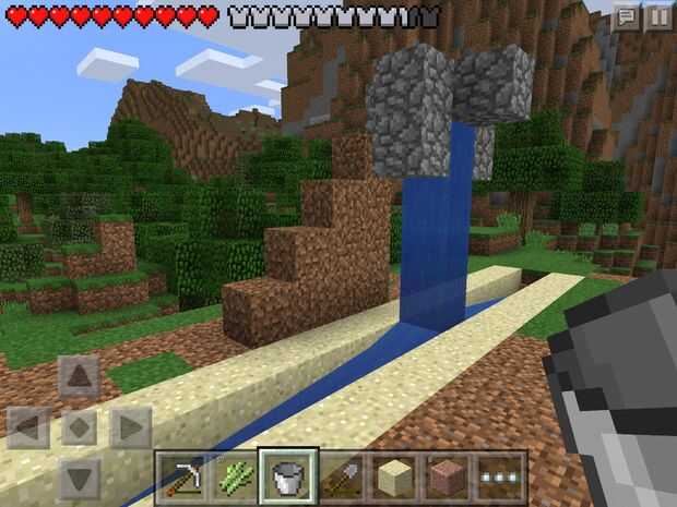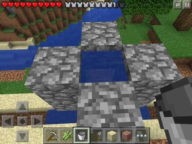 Subir la escalera y coloque un bloque de la fuente de agua con su cubo en el centro de la fuente de agua cruzada. Asegúrese de que esta fuente se encuentra en la capa superior (entre las 4 piezas de adoquines) y no en la capa debajo de él (con las dos piezas de adoquines) si no que el bloque de la fuente de agua desaparece tan pronto como usted comience operar el ciclo de cosechando. El agua ahora debe fluir hacia abajo y hacia los lados y rellenar la zanja entera.