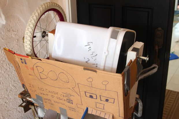 La fachada frontal fue bastante apresurada. No quería que todos los trabajos expuestos a pequeños dedos, así que simplemente corte una pieza grande de cartón para cubrir la parte delantera, con un agujero para el conducto de caramelo. Que no desee cubrir todo, porque la gente disfruta viendo los dulces caer alrededor de.