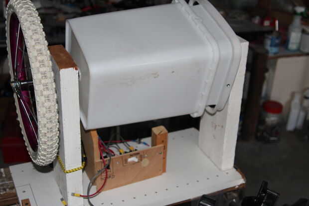 Empuje el otro extremo de la varilla a través del buje en el primer post. Luego a través del orificio en la parte inferior del envase. Entonces trabajan una tuerca abajo a lo largo de la varilla roscada, a donde esperas la tapa que. Entonces la barra pasa a través del orificio central de la tapa, que entonces trabajas hasta la tuerca que previamente colocaste. Añadir una tuerca superior antes de colocar la varilla a través del buje de la segunda, conseguir la tapa en su lugar, use llaves para apretar las tuercas superior e inferior contra la tapa, por lo que está firmemente sujeta a la varilla roscada. Esto tendrá que entregar el esfuerzo de torsión de la varilla al tambor. Por último, añadir a una especie de tuerca de bloqueo en el extremo terminal de la varilla roscada para mantener todo en su lugar. Debe girar libremente sin mucho deslizamiento longitudinal. Agregue las arandelas o lo que sea.