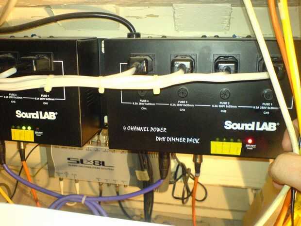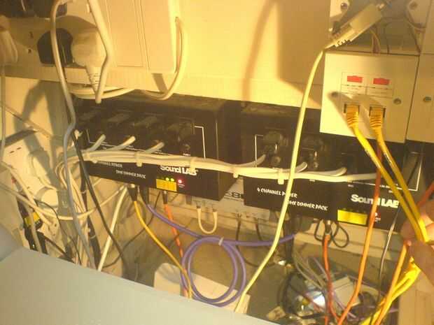 En la parte delantera de la rejilla se puede ver un haz de 1mm T & E cable, cada uno de ellos va a un lugar de iluminación en toda la casa. Sencillamente este cable va desde el regulador recto a la luminaria en el techo, esto hace que el cableado de cualquier luminarias muy fácil, ya que hay sólo un solo cable a contender con. Estos cables están conectados a las barras intensidad con conectores IEC macho (la versión masculina de un plomo de hervidor de agua)