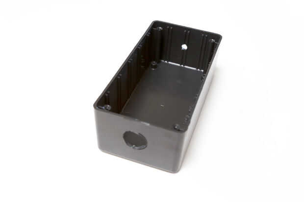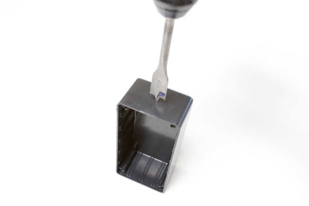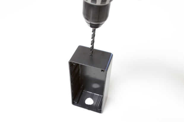 Tomar la 6 "x 2" x 3 "proyecto recinto y taladre un 3/4" centrado sobre el lado más pequeño y un agujero de 1/4" centrada en el otro.