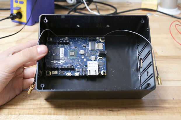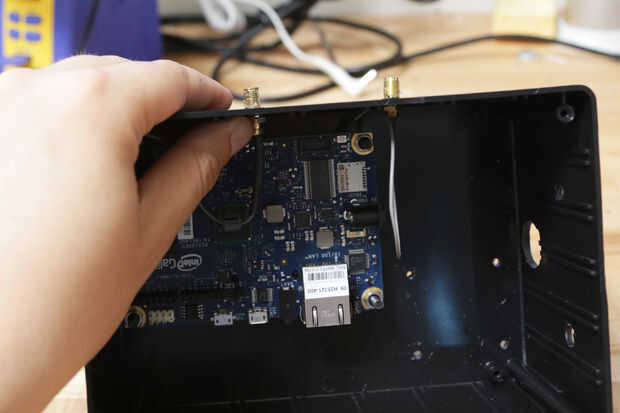 Conecte la tarjeta de wifi y antenas a la tarjeta Galileo si no lo ha hecho ya