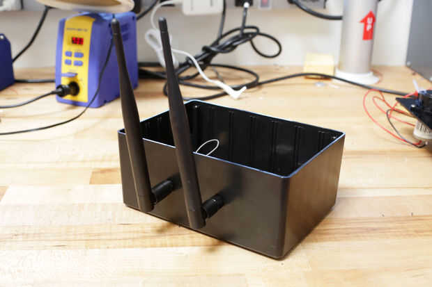 Inserte los conectores de antena roscado en los dos agujeros en el lado más grande de la caja y fije en su lugar con las tuercas de montaje.