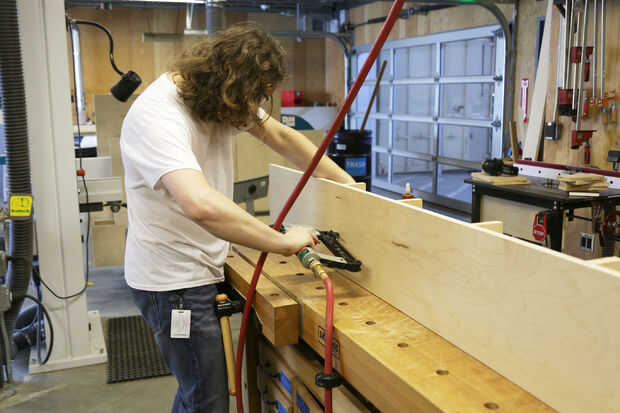 Pegamento en su lugar a lo largo de estas mediciones en ángulo recto y virar luego en su lugar con una clavadora. Salvo una clavadora, también puede pegar y sujetarlos.