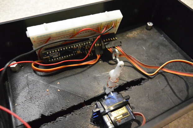 Una vez usted verifique este Coloque un dedo sobre el sensor capacitivo. Esto debe activar el proyecto! Si todo ha sido conectado correctamente los dos servos en la tapa deben ajustar mover lejos del centro. (CCW para el izquierdo y CW para el derecho). Entonces el servo de transporte cigarro debe avanzar. Ahora los dos en la tapa volverá a su posición de inicio/corte. Finalmente el servo del cigarro regresará a casa.