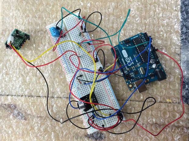 El sensor de temperatura tiene cuatro clavijas, pero sólo tres son realmente conectados a la placa Arduino Uno. El pin de la izquierda se une al poder y el pin de la derecha está conectado a tierra. El eje media izquierdo está conectada con el pin digital de Arduino board 5. El pin de salida se conecta a una resistencia de 1 kohm que va a poder.