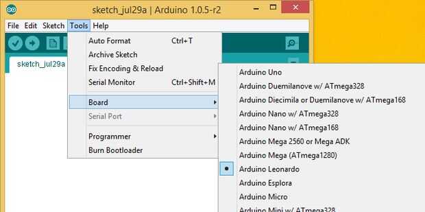Seleccione a la Arduino Leonardo en el menú herramientas.