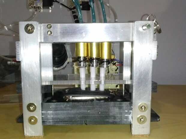 - Una placa intercambiable en una bisagra que sostiene los actuadores neumáticos