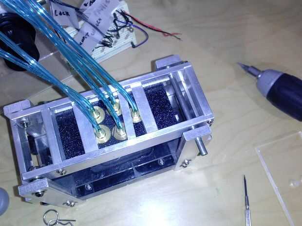 El marco se hace de la acción de la barra de aluminio de ¼ "x ¾". La base está hecha de hojas apiladas de ABS. Una placa de acrílico transparente se utiliza para contener los dedos sobre los botones se ha pulsado. Claro de acrílico fue utilizado porque, puede colocar una placa en blanco sobre el tema, las posiciones de botón se pueden marcar con un rotulador y luego taladrar los agujeros para los dedos con un 3/16" pedacito de taladro. La placa del ABS que sostiene los actuadores será más pequeña que la placa de acrílico a lo largo. Para obtener las ubicaciones del agujero apropiado para los actuadores, simplemente coloque la placa de acrílico con los agujeros en ella sobre la placa ABS y marque los agujeros para los actuadores. Los actuadores son 17/32" de diámetro. Así, los agujeros para los tenga que compensar al lado dependiendo de la proximidad de los botones de uno a. La característica clave del diseño es que una placa con los dedos y la placa que sostiene los actuadores se pueden cambiar hacia fuera para proporcionar una gran variedad de patrones de botón.